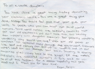 Everyone who made a drop off received an e-waste postcard designed by the school’s students to show their appreciation. Here’s the one we got.