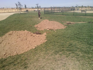 Tuesday afternoon dog owners noticed a landscaping crew in the park working to repair drainage problems which had been attributed to illness in some pets. The crew planned to fence off the troubled area and reseed.
