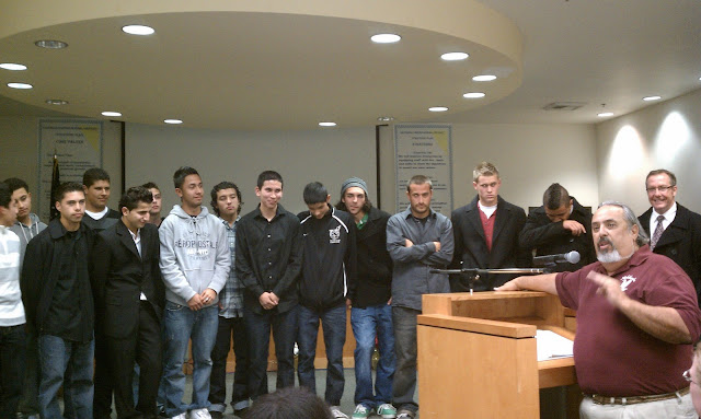 Members of the Natomas High School boys’ varsity soccer team are celebrated Wednesday at the Natomas Unified School District board meeting.