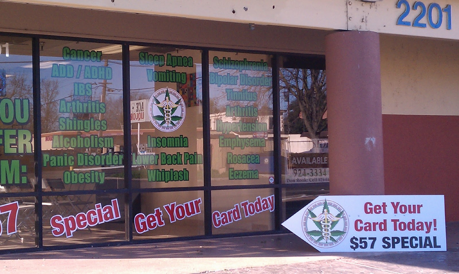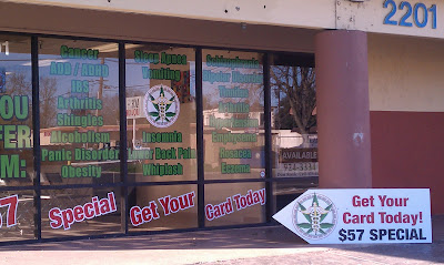 Those window messages are nothing more than not-so-subtle suggestions of things customers can PRETEND to have as they engage the “doctor” in the white coat behind the counter as he checks a box on the form to justify a “recommendation” (NOT a “prescription” as is so often stated in error) for marijuana.