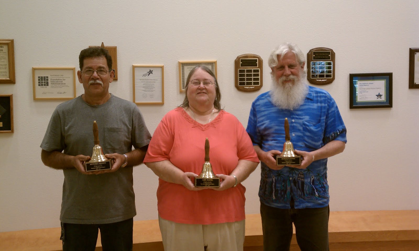 | A HANDFUL OF NATOMAS UNIFIED SCHOOL DISTRICT RETIREES WERE ON HAND WEDNESDAY WHEN THEY WERE HONORED WITH GOLDEN SCHOOL BELLS PRESENTED BY THE SCHOOL BOARD. PICTURED HERE: ANTONIO, JUDI AND DONALD. |