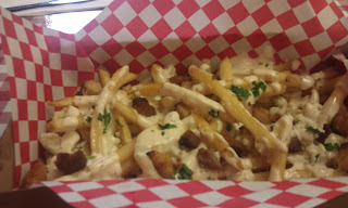 The Grub Shack is modestly decorated with black and white stripped valances and red checkered table cloths. Over the register and prep area is a simulated shingled roof. I quickly determined the simple décor did not translate to simplicity on the menu.